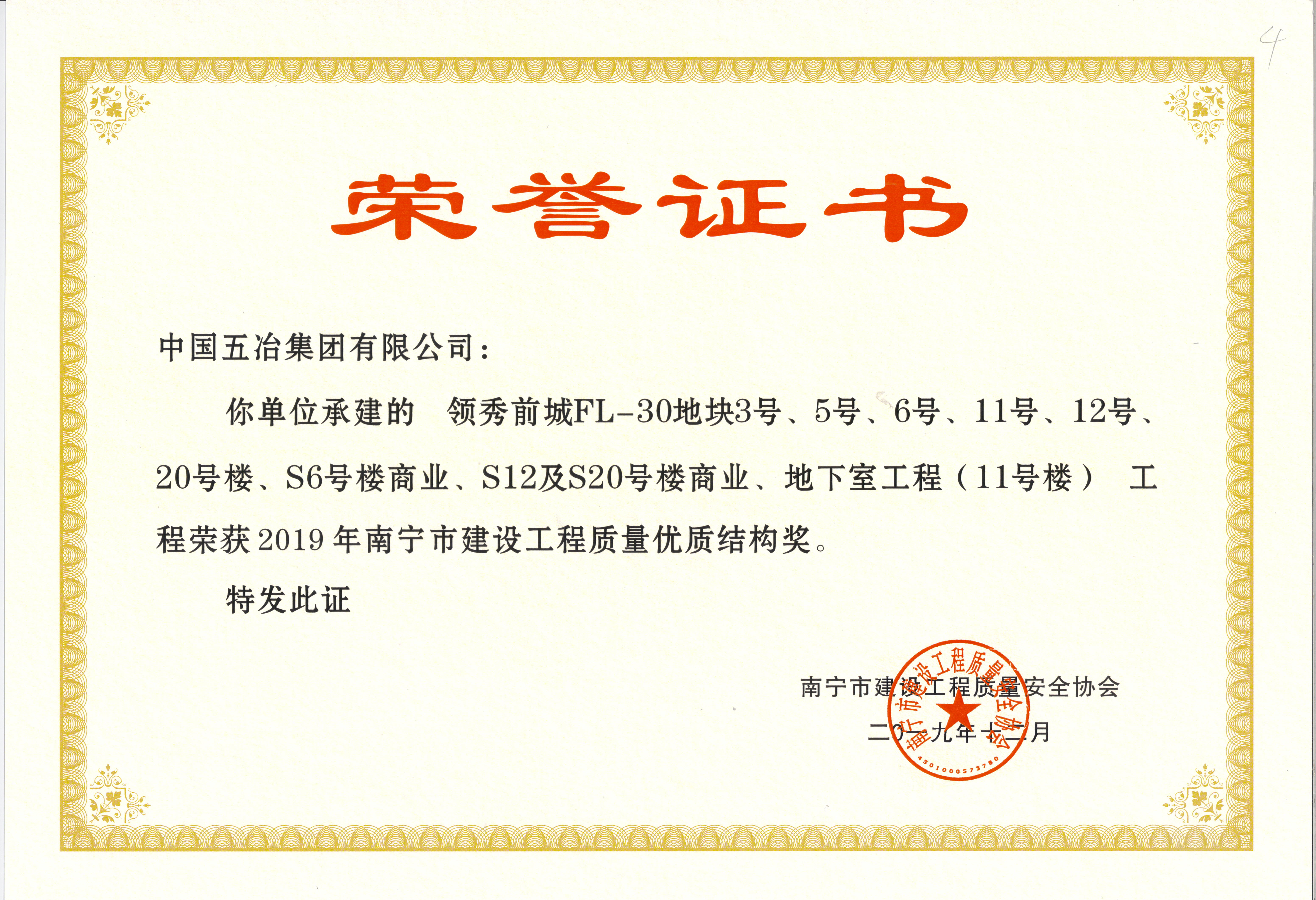 領(lǐng)秀前城FL-30地塊工程—2019年南寧市建設(shè)工程質(zhì)量優(yōu)質(zhì)結(jié)構(gòu)獎