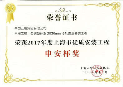 包鋼新體系2030mm冷軋連退安裝工程-2017年度上海市優(yōu)質安裝工程申安杯獎