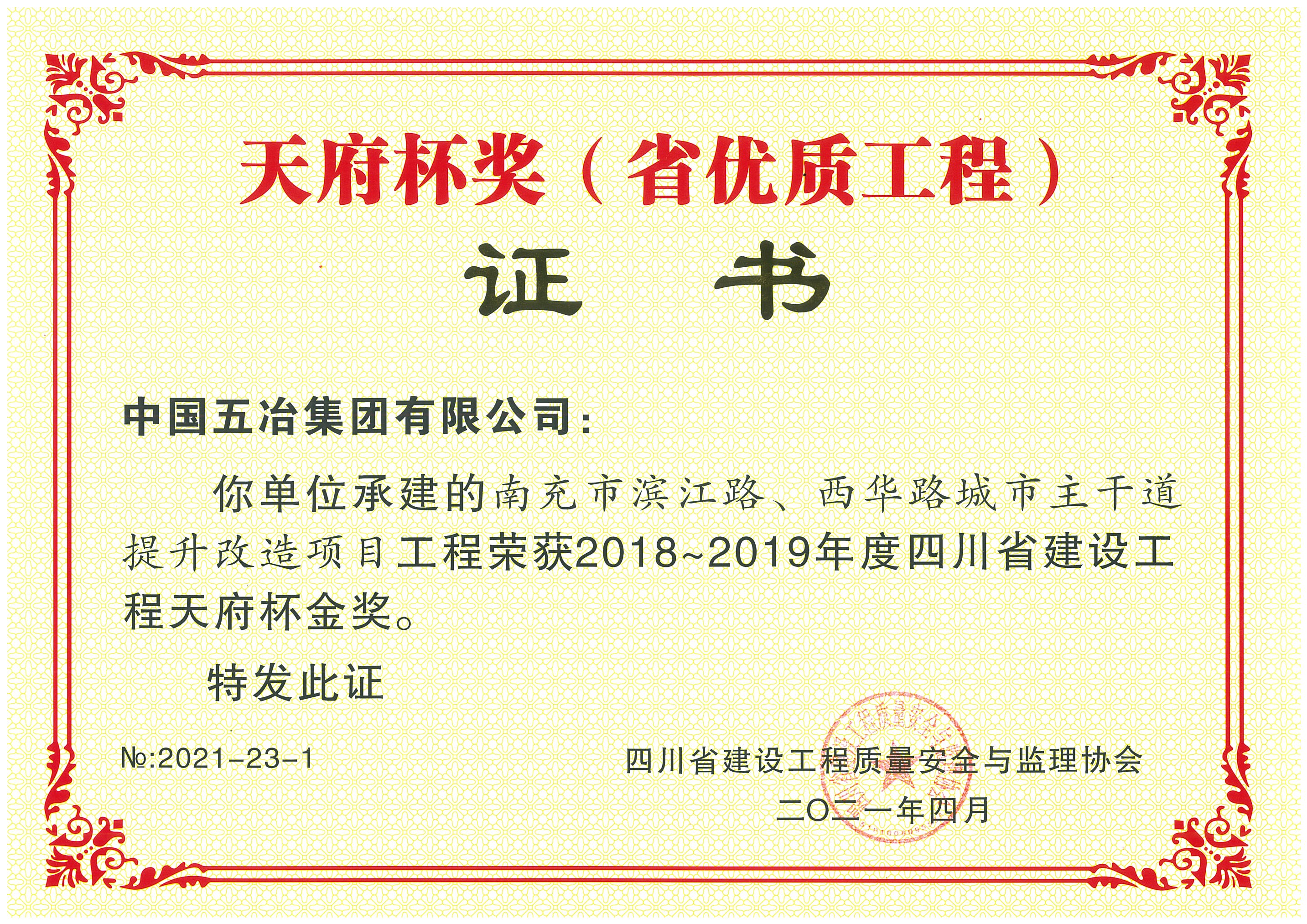 14-南充市濱江路、西華路城市主干道提升改造項目-2018年度四川省用戶滿意建筑工程證書