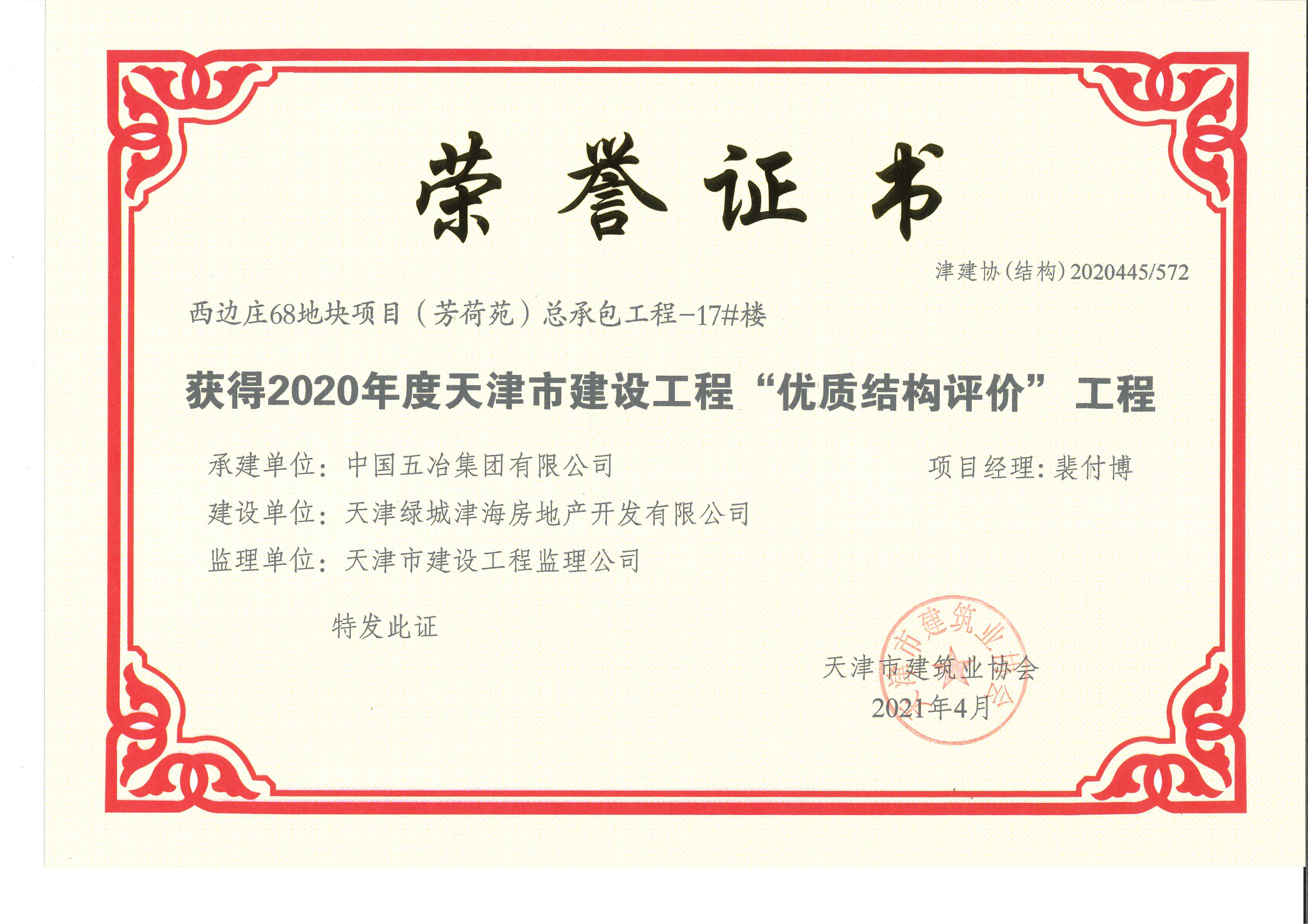 天津靜海綠城(西邊莊68地塊項目-芳荷苑總承包工程-17號樓)--2020年天津優(yōu)質(zhì)結(jié)構(gòu)評價