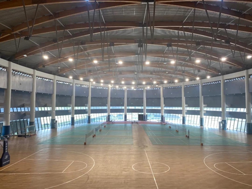 “天府小巨蛋”面積約4611平方米,位于飛行保障園區(qū)中心位置,分為地上兩層,地下局部一層。一層布置有球場、器械室、空調(diào)機房、男女衛(wèi)生間及淋浴室等,二層為音控室、管理用房等,負一層為健身房等;一層內(nèi)部球場布置有1個籃球場,8個羽毛球場,8個乒乓球桌,滿足多種運動需求。