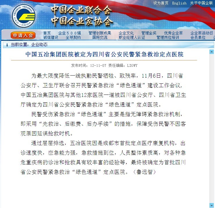 中國企業(yè)聯(lián)合會報道:中國五冶集團醫(yī)院被定為四川省公安民警緊急救治定點醫(yī)院