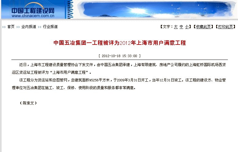 中國工程建設網(wǎng)報道:中國五冶集團一工程被評為2012年上海市用戶滿意工程