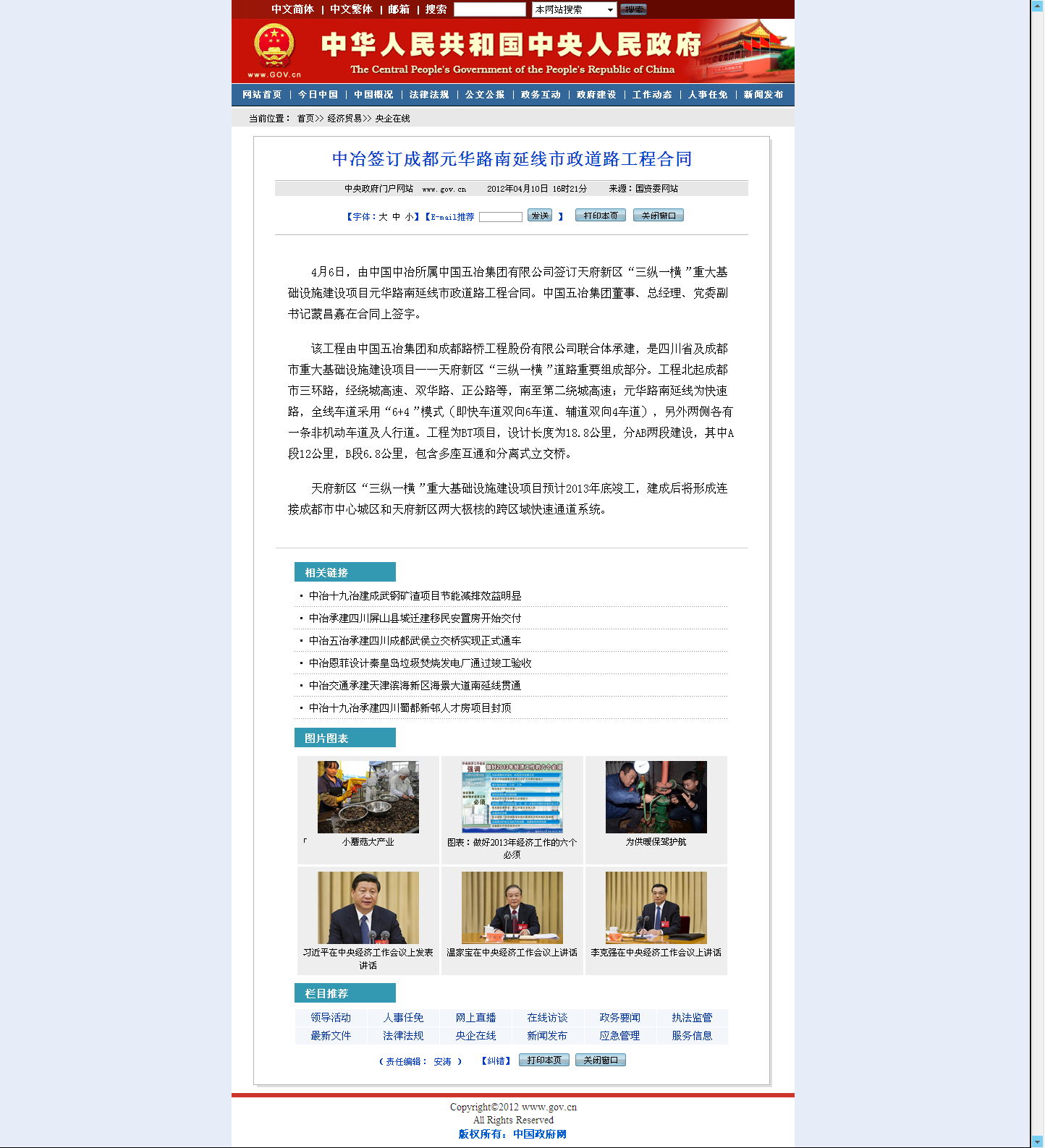 中央人民政府網報道:中冶簽訂成都元華路南延線市政道路工程合同
