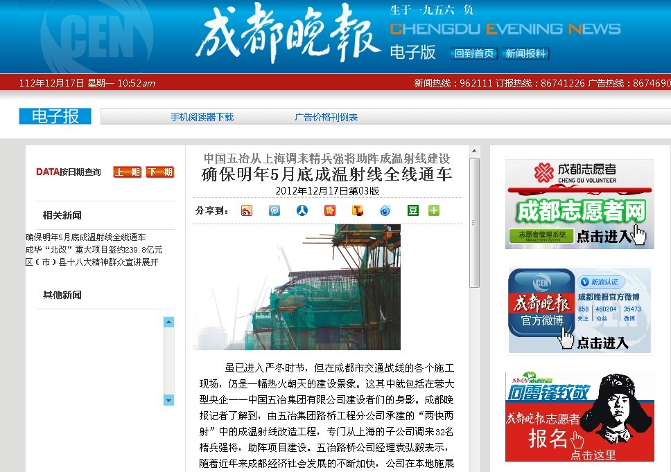 雖已進(jìn)入嚴(yán)冬時(shí)節(jié),但在成都市交通戰(zhàn)線的各個(gè)施工現(xiàn)場(chǎng),仍是一幅熱火朝天的建設(shè)景象。這其中就包括在 蓉大型央企——中國(guó)五冶集團(tuán)有限公司建設(shè)者們的身影。成都晚報(bào)記者了解到,由五冶集團(tuán)路橋工程分公司承建的“兩快兩射”中的成溫射線改造工程,專門從上海 的子公司調(diào)來32名精兵強(qiáng)將,助陣項(xiàng)目建設(shè)。五冶路橋公司經(jīng)理袁弘毅表示,隨著近年來成都經(jīng)濟(jì)社會(huì)發(fā)展的不斷加快,公司在本地施展拳腳的空間也越來越大, “我們有信心,為家鄉(xiāng)的建設(shè)不斷添磚加瓦?!?/p>