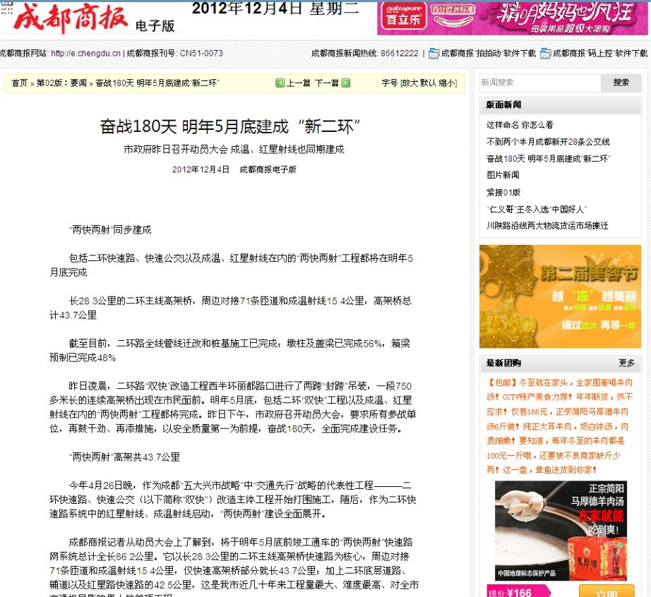 成都商報(bào)報(bào)道:奮戰(zhàn)180天 明年5月底建成“新二環(huán)”