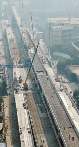 在整個(gè)高架橋橋面全線貫通之后,下一步,中國五冶則將全力以赴地進(jìn)行橋面系以及底層道路等的建設(shè)施工。