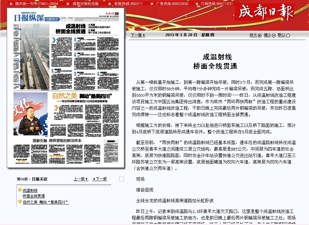 截至目前,“兩快兩射”的成溫路射線已經(jīng)基本成型,通車后的成溫路射線將在成溫立交橋至青羊大道之間建成三層立交結(jié)構(gòu),最高層是BRT公交,中間層為四車道的社會(huì)高架,底層為快速路路面,同時(shí)在金沙車站設(shè)置快速公交進(jìn)出站引道。青羊大道口至三環(huán)路蘇坡立交東為一層高架設(shè)置,底層地面輔道為雙向六車道,高架層為雙向六車道(含快速公交兩車道)。