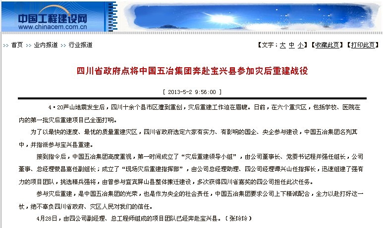 中國工程建設(shè)網(wǎng)報道:四川省政府點將中國五冶集團奔赴寶興縣參加災(zāi)后重建戰(zhàn)役