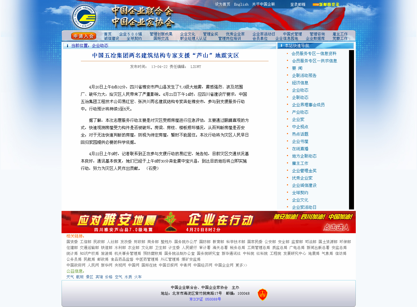 中國企業(yè)聯(lián)合會網(wǎng)報道:中國五冶集團兩名建筑結構專家支援“蘆山”地震災區(qū)
