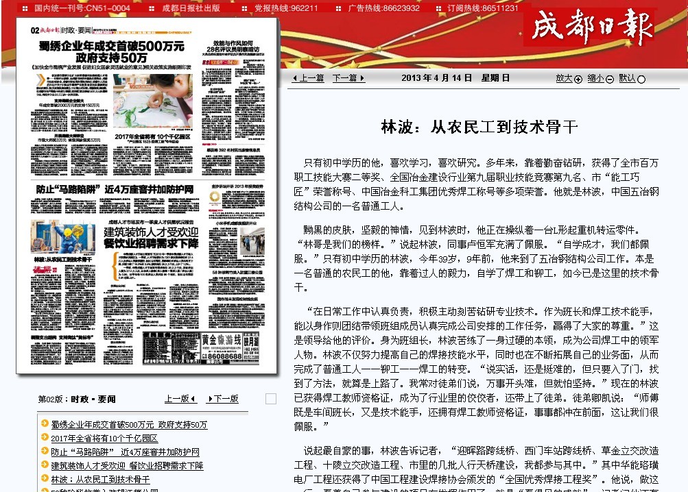 說(shuō)起最自豪的事,林波告訴記者,“迎暉路跨線橋、西門(mén)車(chē)站跨線橋、草金立交改造工程、十陵立交改造工程、市里的幾批人行天橋建設(shè),我都參與其中。”其中華能珞璜電廠工程還獲得了中國(guó)工程建設(shè)焊接協(xié)會(huì)頒發(fā)的“全國(guó)優(yōu)秀焊接工程獎(jiǎng)”。他說(shuō),做這一行,看著自己參與建設(shè)的項(xiàng)目在發(fā)揮作用了,就是“看得見(jiàn)的成就”。記者問(wèn)他還有什么“看不見(jiàn)的成就”,這位不善言辭的漢子笑著說(shuō),“老婆兒子都來(lái)成都了,生活比以前好多了?!彪m然現(xiàn)在的他還在外面租房子住,但他的幸福很簡(jiǎn)單,家人在身邊就好。面對(duì)成績(jī)和榮譽(yù),林波顯得很淡定,“焊接好每一具構(gòu)件,是自己的本職工作,只有每個(gè)焊縫都焊接合格,我們提供的產(chǎn)品才經(jīng)得住考驗(yàn)?!?