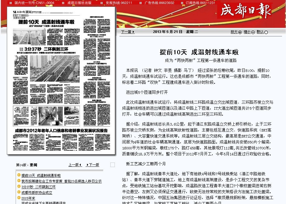 經(jīng)過緊張的后期收尾,昨日8:00,提前10天,成溫射線通車試運行。這也是成都市“兩快兩射”工程第一條通車的道路,同時,標(biāo)志著二環(huán)路“雙快”工程建成通車進(jìn)入倒計時階段。