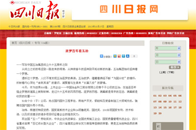 10月17日,四川日?qǐng)?bào)以《逐夢(mèng)百年看五冶》為題對(duì)中國五冶集團(tuán)進(jìn)行了整版重點(diǎn)報(bào)道,內(nèi)文以“開啟夢(mèng)想、跨越之夢(mèng)、騰飛之夢(mèng)”回顧了中國五冶集團(tuán)六十五周年的發(fā)展歷程,并對(duì)建設(shè)百年五冶的偉大目標(biāo)進(jìn)行了展望。
