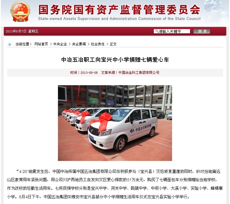 國資委報道:中冶五冶職工向?qū)毰d中小學捐贈七輛愛心車