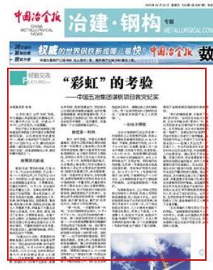 10月23日,《中國(guó)冶金報(bào)》在第5版頭條,以“彩虹的考驗(yàn)”為題,對(duì)中國(guó)五冶集團(tuán)迎擊彩虹臺(tái)風(fēng),積極投入人力物力確保湛鋼項(xiàng)目順利復(fù)產(chǎn)進(jìn)行了紀(jì)實(shí)報(bào)道。