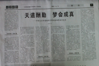 4月9日,《建筑時(shí)報(bào)》第3209期第七版頭條以《天道酬勤?夢(mèng)會(huì)成真——中國(guó)五冶承建越南臺(tái)塑河靜鋼鐵項(xiàng)目紀(jì)實(shí)》為題,從“初戰(zhàn)告捷,業(yè)精于勤;遭遇轉(zhuǎn)折,化險(xiǎn)于勤;涅槃重生,?夢(mèng)圓于勤”三個(gè)方面,刊文報(bào)道了中國(guó)五冶集團(tuán)海外項(xiàng)目管理中較先進(jìn)和較成熟的管理模式,對(duì)中國(guó)五冶為確保項(xiàng)目履約質(zhì)量而配備的高效實(shí)用的應(yīng)急處理機(jī)制進(jìn)行了詳細(xì)梳理。