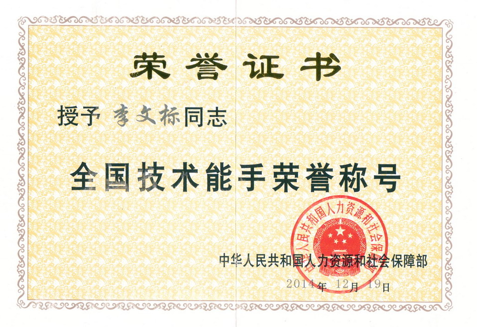 ????? 2014年12月19日,李文標(biāo)同志榮獲國(guó)家人力資源社會(huì)保障部“全國(guó)技術(shù)能手”稱號(hào)。