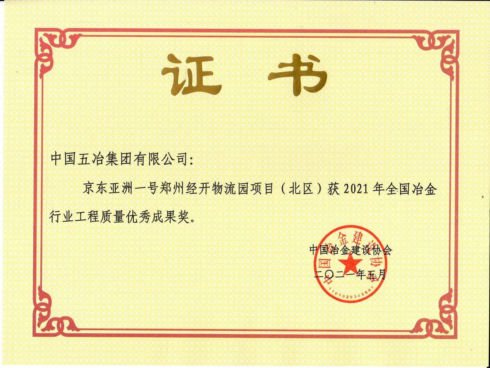 京東亞洲一號(hào)鄭州經(jīng)開物流園項(xiàng)目(北區(qū))榮獲2021年全國(guó)冶金行業(yè)工程質(zhì)量?jī)?yōu)秀成果獎(jiǎng)