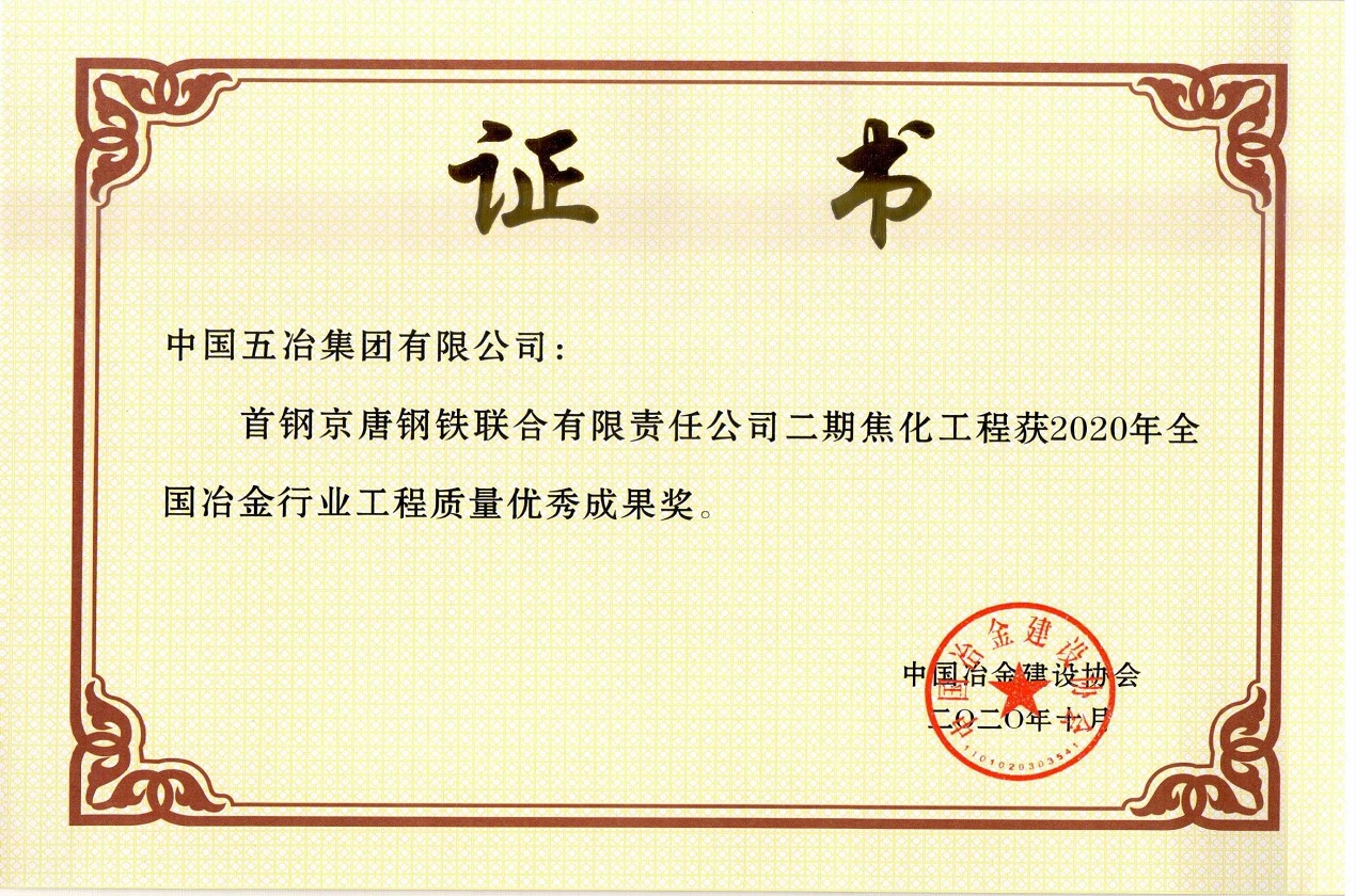 首鋼京唐鋼鐵聯(lián)合有限責(zé)任公司二期焦化工程榮獲2020年全國冶金行業(yè)工程質(zhì)量優(yōu)秀成果獎