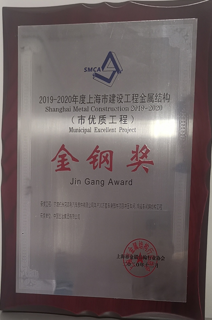 寧波杭州灣吉利汽車部件有限公司年產(chǎn)30萬套車身部件項目標(biāo)準(zhǔn)車間鋼結(jié)構(gòu)工程獲2019-2020年度第二批上海市建設(shè)工程金屬結(jié)構(gòu)“金鋼獎”(市優(yōu)質(zhì)工程)