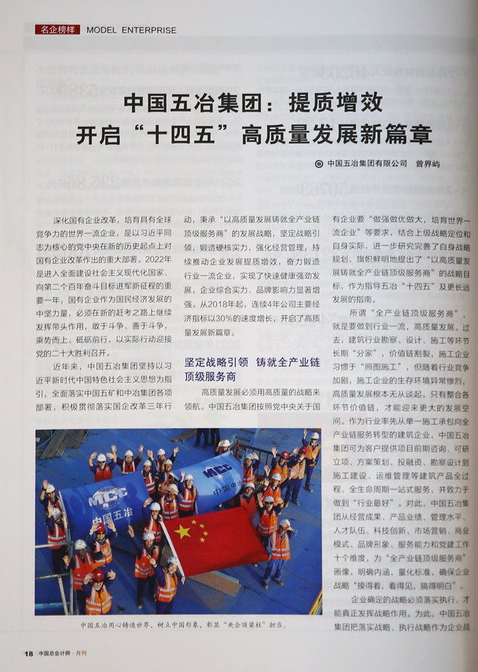 近日,由中國總會(huì)計(jì)師協(xié)會(huì)主辦的《中國總會(huì)計(jì)師》雜志在3月兩會(huì)特刊以《中國五冶集團(tuán):提質(zhì)增效 開啟“十四五”高質(zhì)量發(fā)展新篇章》為題,大篇幅報(bào)道了中國五冶集團(tuán)在實(shí)施“十四五”規(guī)劃、開啟全面建設(shè)社會(huì)主義現(xiàn)代化國家新征程的奠基之年,堅(jiān)定發(fā)展戰(zhàn)略,鍛造硬核實(shí)力,強(qiáng)化經(jīng)營管理,穩(wěn)促高質(zhì)發(fā)展的生動(dòng)案例,展現(xiàn)了中國五冶作為行業(yè)標(biāo)桿的一流品牌形象。