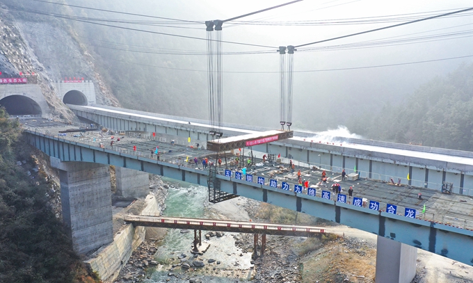 項目鋼結(jié)構(gòu)技術(shù)負(fù)責(zé)人黃治銘介紹,項目所處高山峽谷地帶地勢陡峭,無法提供大型起吊設(shè)備進(jìn)入施工現(xiàn)場的通道,加之大橋下方的平通河河道狹窄,傳統(tǒng)的機械吊裝和船只運輸將對河流生態(tài)帶來破壞?!白罱K,考慮到大橋特殊的地理環(huán)境,施工團隊研發(fā)了國內(nèi)首創(chuàng)的纜索吊裝懸拼安裝工藝,將大橋分成共計94節(jié)不同節(jié)段,采用單組60噸、雙組85噸的纜索吊解決垂直與水平運輸難題,并借助混凝土梁掛籃施工的思路,運用懸挑法對稱拼裝,實現(xiàn)20萬套螺栓的100%穿孔,成功完成大橋共計5525噸鋼結(jié)構(gòu)的安裝任務(wù)?!?/p>
