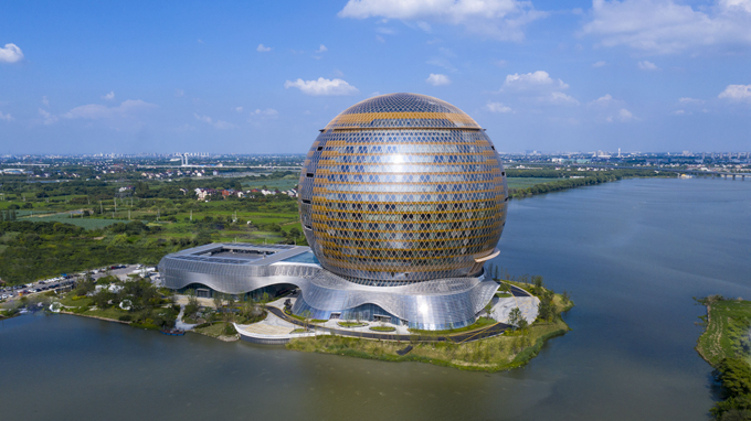 湖州太陽(yáng)酒店項(xiàng)目位于浙江湖州南潯區(qū),是主體直徑97.2米的世界最大球體建筑,也是集住宿、餐飲、娛樂、旅游等多功能于一體的五星級(jí)綜合性酒店。項(xiàng)目通過深度應(yīng)用建筑信息技術(shù),建立了覆蓋各個(gè)專業(yè)和建設(shè)全周期的“全科醫(yī)生檔案”,不僅為施工質(zhì)量及安全保駕護(hù)航,同時(shí),針對(duì)球體鋼結(jié)構(gòu)、單層穹頂網(wǎng)殼提升、弧形管道深化及預(yù)制等方面難題重點(diǎn)突破,讓太陽(yáng)得以驚艷“閃耀”,成為湖州的城市地標(biāo)和熱門網(wǎng)紅打卡點(diǎn)。
