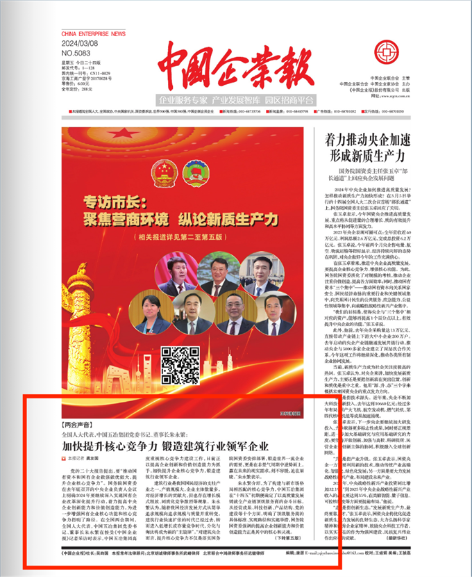2024年全國兩會(huì)期間,全國人大代表,中國五冶集團(tuán)黨委書記、董事長朱永繁接受多家權(quán)威主流媒體專訪,積極履職建言獻(xiàn)策,實(shí)事求是講述五冶高質(zhì)量發(fā)展情況。3月8日,《中國企業(yè)報(bào)》頭版以《加快提升核心競(jìng)爭力 鍛造建筑行業(yè)領(lǐng)軍企業(yè)》為題刊發(fā)對(duì)朱永繁代表的專訪報(bào)道,現(xiàn)對(duì)報(bào)道進(jìn)行全文轉(zhuǎn)發(fā)。