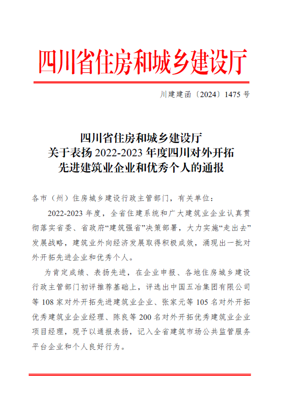 近日,四川省住房和城鄉(xiāng)建設廳印發(fā)《關于表揚2022-2023 年度四川對外開拓先進建筑業(yè)企業(yè)和優(yōu)秀個人的通報》,中國五冶集團榮獲多項表彰。