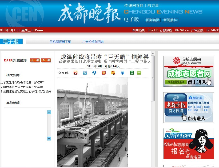 在成溫射線,多段連續(xù)小箱梁已經(jīng)現(xiàn)身。2.5環(huán)至蘇坡立交段,截至上月10日,能吊裝的小箱梁已經(jīng)全部貫通,橋面系、路面工程全面施工;2.5環(huán)至二環(huán)段,除2.5環(huán)路口220米外,其他的橋面系、路面施工也已全面鋪開(kāi)。