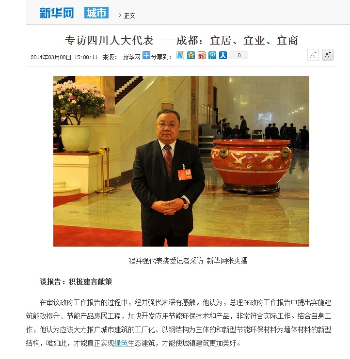 全國(guó)兩會(huì)期間,3月8日,新華網(wǎng)刊文播發(fā)了新華網(wǎng)記者采訪四川代表團(tuán)的新聞,圍繞“成都:宜居、宜業(yè)、宜商”主題,對(duì)來(lái)自成都的全國(guó)人大代表進(jìn)行了專訪。