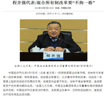經濟日報、中國經濟網以“混合所有制改革要‘不拘一格’為題,就如何推動混合所有制改革等問題對程并強進行了專訪。程并強認為,當前國企改革中,應吸取經驗教訓,避免因為不規(guī)范導致出現(xiàn)問題。應該從以下幾個方面努力。一是需要多種形式,不能狹隘的理解混合所有制,就是“拿出”國有資產,讓民營企業(yè)參與進來。二是需要防止國有資產流失。三是人才選用與薪酬體系,應與市場接軌。