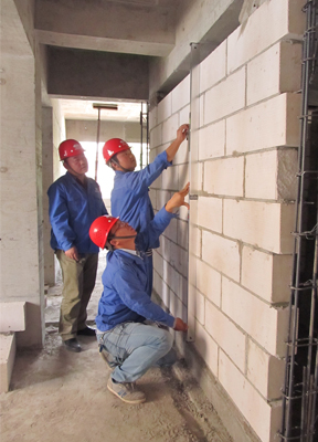 機械化公司昆鐵家園的管理人員正在進行內(nèi)墻砌筑質(zhì)量檢測