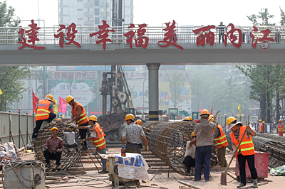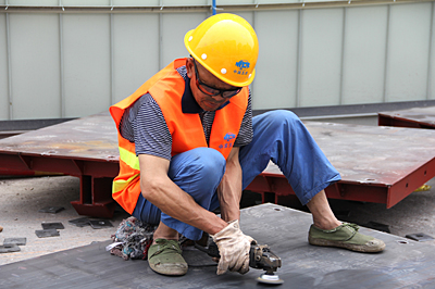 內(nèi)江邱家嘴立交橋項目的工作人員正在給鋼板打磨