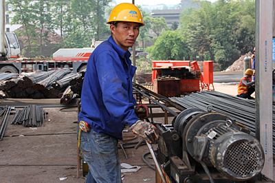 內(nèi)江邱家嘴立交橋項目的工作人員正在鋼筋操作間做切割處理