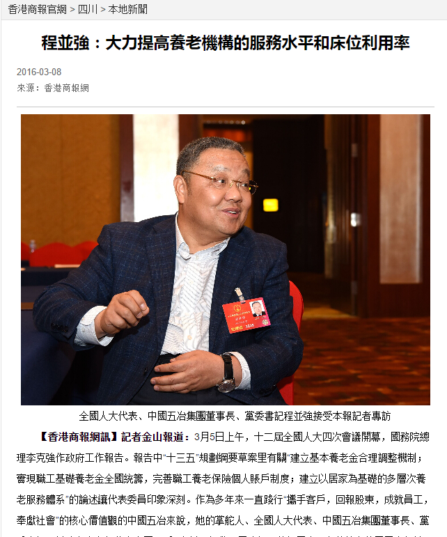 《香港商報網(wǎng)》記者以“大力提高養(yǎng)老機構(gòu)的服務水平和床位利用率”為題,從李克強總理的工作報告中“十三五”規(guī)劃綱要草案里有關“建立基本養(yǎng)老金合理調(diào)整機制;實現(xiàn)職工基礎養(yǎng)老金全國統(tǒng)籌等,完善職工養(yǎng)老保險個人賬戶制度;建立以居家為基礎的多層次養(yǎng)老服務體系等”出發(fā),就如何提高養(yǎng)老機構(gòu)服務水平,如何提高養(yǎng)老床位利用率等話題,對全國人大代表,中國五冶集團董事長、黨委書記程并強進行了專訪。