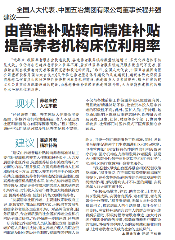 3月8日,《成都日報》和《香港商報網(wǎng)》分別刊文就全國人大代表,中國五冶集團董事長、黨委書記程并強向大會提交的《關于推進養(yǎng)老服務體系建設的幾點建議》進行了詳細的采訪報道。