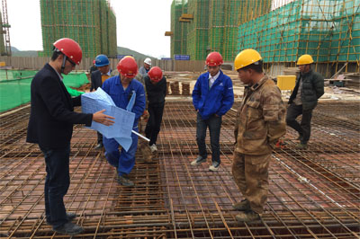 貴陽貴安新區(qū)大壩項目管理人員正在現(xiàn)場進行地下車庫頂板鋼筋驗收