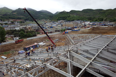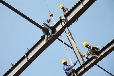 平塘星辰主題酒店鋼結(jié)構(gòu)裙樓,工人正在鋼梁上焊接檁托板