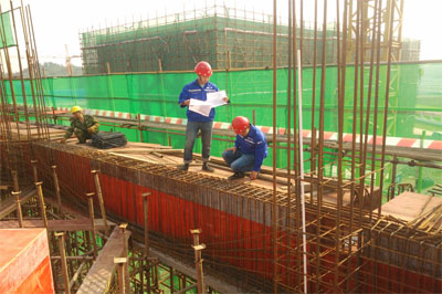 南充鑫達項目技術(shù)員在對鋼筋綁扎、梁柱截面尺寸進行例行檢查