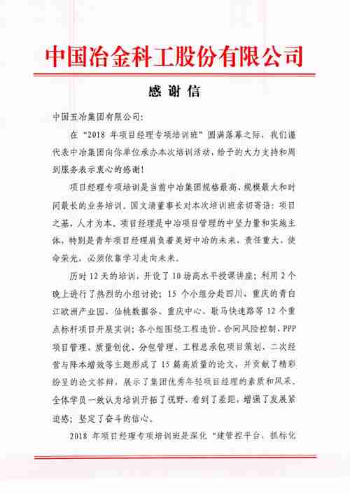 感謝信表示,培訓(xùn)工作的圓滿完成凝聚了中國五冶員工的心血和汗水,中國五冶與集團(tuán)工程建設(shè)管理部、人力資源部攜手完成此次任務(wù),經(jīng)受住了籌備工作時(shí)間緊、任務(wù)重、要求嚴(yán)的考驗(yàn)。這份榮譽(yù),屬于和我們一起奮斗過的所有參與者!