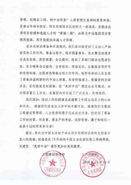 11月13日,中國冶金科工股份有限公司工程建設(shè)管理部、人力資源部向中國五冶發(fā)來感謝信,對(duì)公司在承辦中冶集團(tuán)2018年項(xiàng)目經(jīng)理專項(xiàng)培訓(xùn)活動(dòng)過程中展現(xiàn)的嚴(yán)細(xì)新實(shí)的工作作風(fēng)表示肯定。