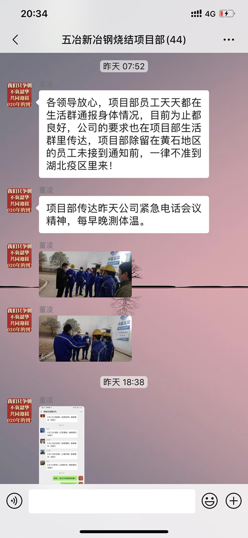 危難當(dāng)頭不怯懦,只因黨徽伴吾心。疫情發(fā)生后,燒結(jié)項(xiàng)目黨支部書記董凌第一個(gè)站出來,帶領(lǐng)項(xiàng)目留守人員以最快速度轉(zhuǎn)入緊急狀態(tài),組織大家密切分工配合,緊急采購口罩、消毒液等防護(hù)物資,封閉作業(yè)現(xiàn)場、辦公區(qū)和生活區(qū),設(shè)置隔離室,專人消毒,錯(cuò)峰就餐。董凌帶頭示范,每天拿著測(cè)溫槍在大門口等候工人師傅,一個(gè)個(gè)量體溫,叮囑他們佩戴好口罩。