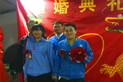 5月28日,青島即墨項目部建筑一線的陳曉東與妻子李海燕因工期緊、任務重,沒有時間回老家舉辦婚禮,同事們在工地為他們舉辦了這場特別婚禮,項目部還為新人布置了婚房,雖然是工地上的活動板房,但婚房在大紅喜字、彩帶的裝扮下,顯得非常溫馨喜慶。